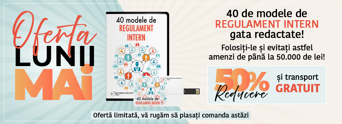 Oferta lunii pentru lucrarea:40 Modele de Regulament Intern Pret special valabil doar luna aceasta: 124 lei + TVA, redus cu 50% fata de pretul standard de 247 lei + TVA!